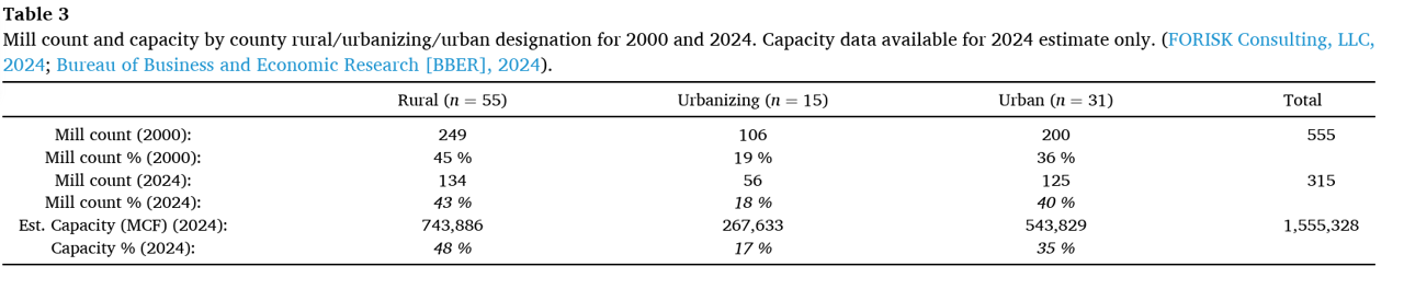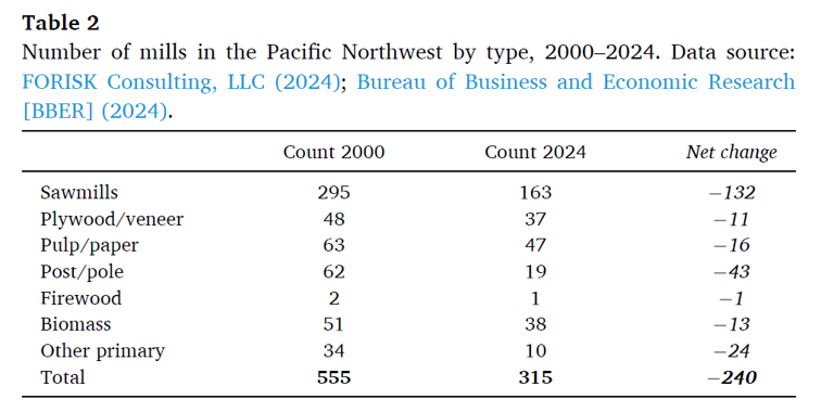 Today, the state of this “social contract” appears to be dangerously fraying, according to researchers at Oregon State University and the US Department of Agriculture. The group studied forest sector infrastructure trends across the Northwest region. What they found is evidence of serious concern. They found a steep loss of mill infrastructure over time. As Table 2 shows, the total mill count fell from 555 in 2000 to 315 in 2024. Yet even after that decline, rural counties still hold the largest share of remaining processing capacity. The message is hard to miss: as the region loses mills, it is also weakening the infrastructure that helps keep working forests working — and the rural communities most tied to them.